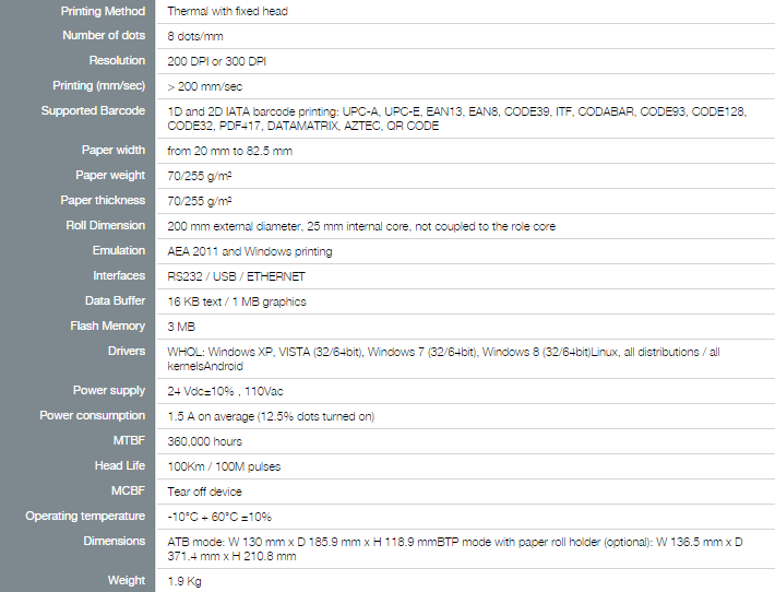 - 1D and 2D IATA barcode printing: UPC-A, UPC-E, EAN13, EAN8, CODE39, ITF, CODABAR, CODE93, CODE128, CODE32, PDF417, DATAMATRIX, AZTEC, QR CODE