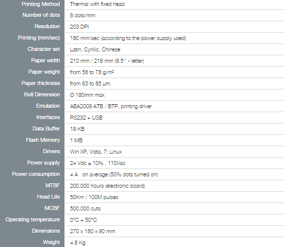 - Sensors: Head temperature, paper presence, notch sensor,outfeed paper presence, near paper end (optional)