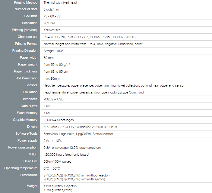 - Sensors: head temperature, paper presence, anti paper jamming, ticket collection, paper end and near paper end